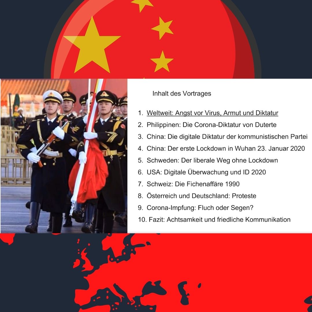 Die Botschaft aus China lautet: Mit Lockdown, Quarantäne, Social Distancing, PCR-Tests, Kontaktnachverfolgung, Impfung und Totalüberwachung aller Bürger lässt sich eine komplette Eindämmung des Corona-Virus erreichen. Daniele Ganser zitiert in seinem Vortrag den israelischen Historiker Yuval Noah Harari, der warnte, dass zentrale Merkmale des chinesischen Systems sich auch auf Europa und die USA ausdehnen könnten: «Wir sind heute in der Lage, die perfekte Diktatur zu errichten … Zum ersten Mal in der Geschichte ist totale Überwachung möglich … Die totalitäre Versuchung ist in Zeiten von Corona groß.”